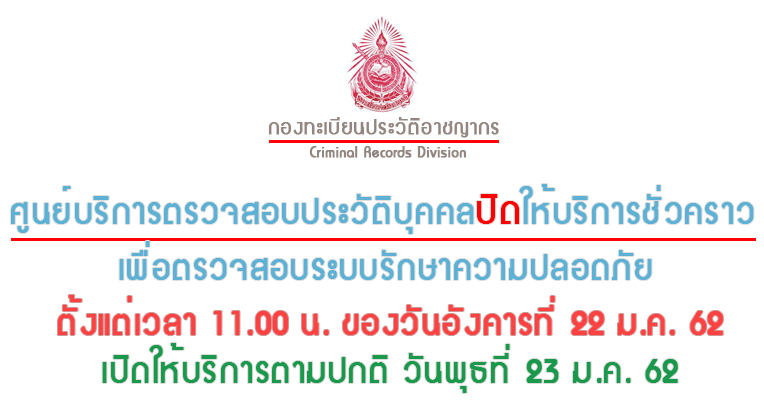 - ศูนย์บริการตรวจสอบประวัติบุคคล เปิดทำการตั้งแต่เวลา 07.30 น.- 16.30 น. (ยกเว้นวันหยุดราชการ วันหยุดนักขัตฤกษ์ และวันหยุดพิเศษ)
